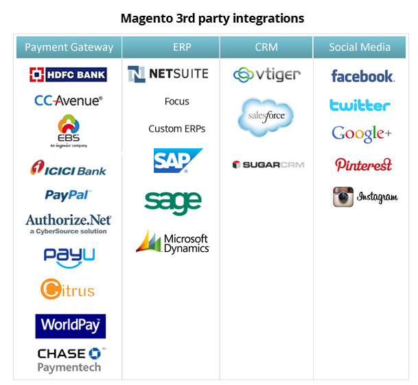 Neev has done a number of Magento 3rd party integrations with Payment Gateways, ERP and CRM packages. Our team can integrate any 3rd party tools you may have.